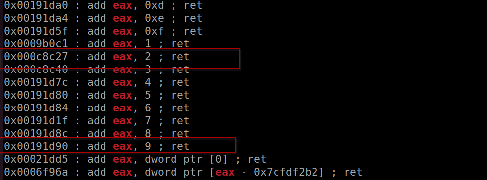 ROPgadget --binary /usr/lib32/libc.so.6 --only "add|ret" | grep "eax"
