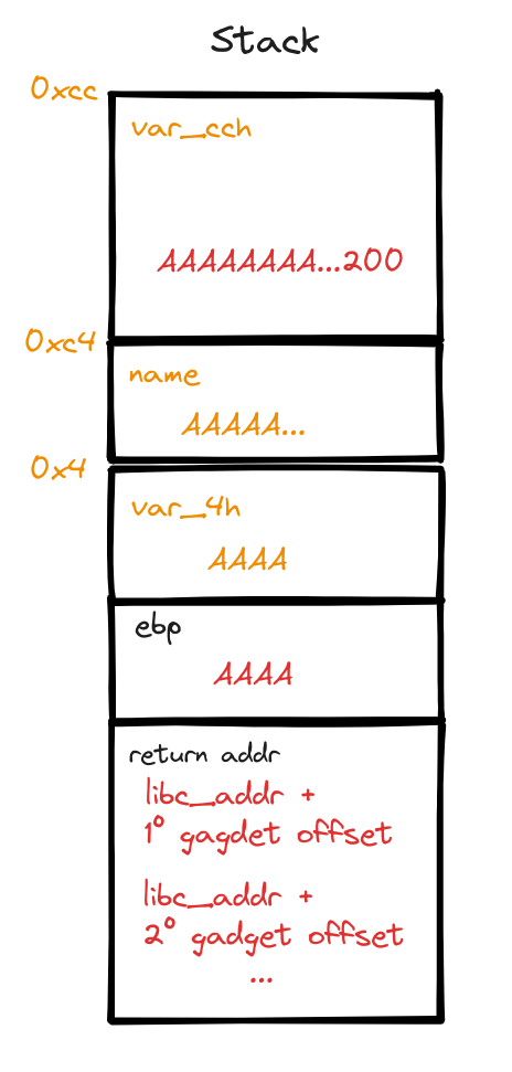 var_cchornameand 4 forebp). However, the presence ofvar_4hmeans we need to adjust our payload by adding 4 more bytes. The variable “name,” located at an offset of 196 (or 0xC4 in hexadecimal), is not a concern as it falls within the 200-byte range we are already overwriting.
