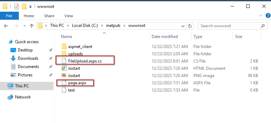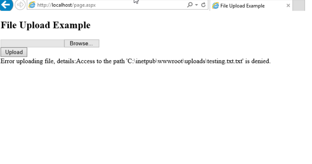 To simulate a file upload scenario, we’ll create an application. Check out the code for two files that need to be placed in the specified path: C:\inetpub\wwwroot.