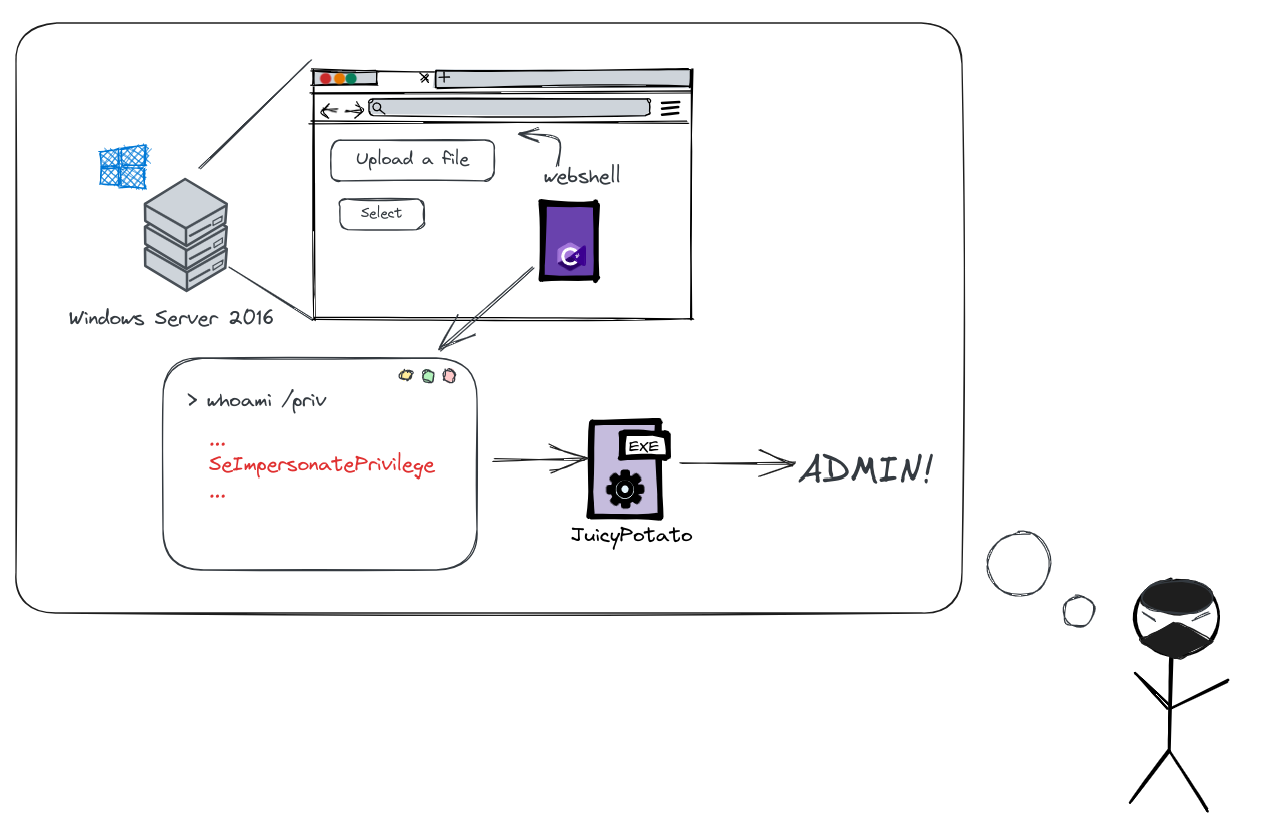 Here, I’d like to make a brief side note. In this case, I’m using JuicyPotato, an exploit that abuses SeImpersonatePrivilege. However, there are various exploits available, and the choice may depend on the specific server and its version.