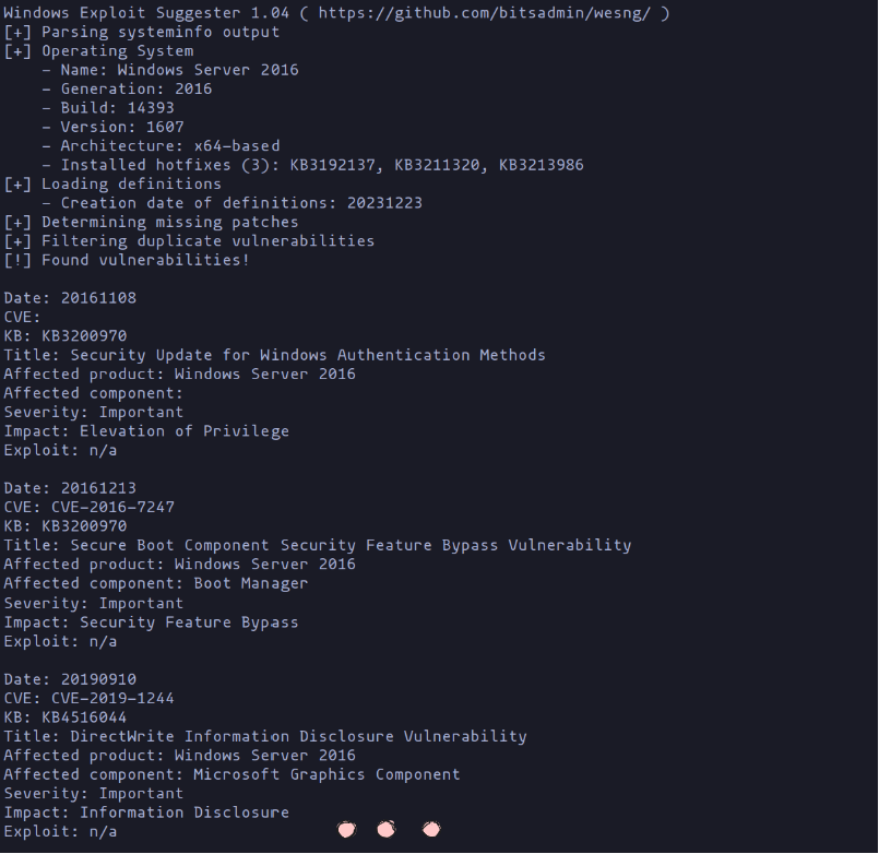 However, be aware that windows-exploit-suggester may not recognize many modern operating systems because it’s quite old. Consequently, I recommend using wes.py instead. Here is the tool: