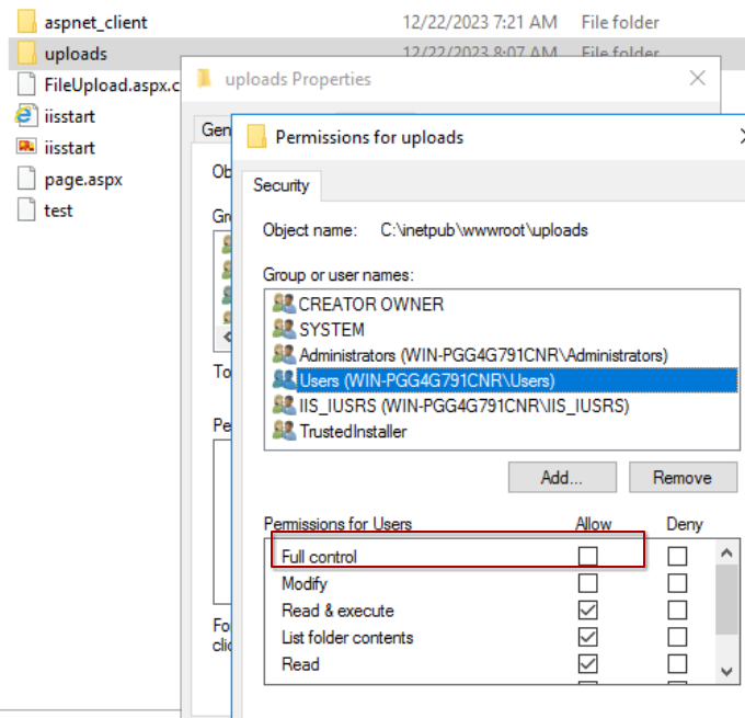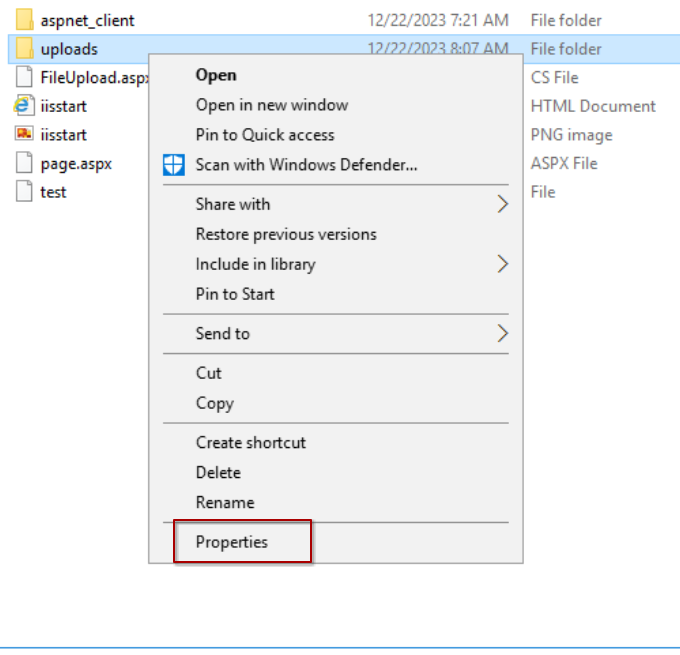 To address this, you can adjust the privileges of the folder where the uploaded files are stored. You can accomplish this through the Security section within the folder properties.
