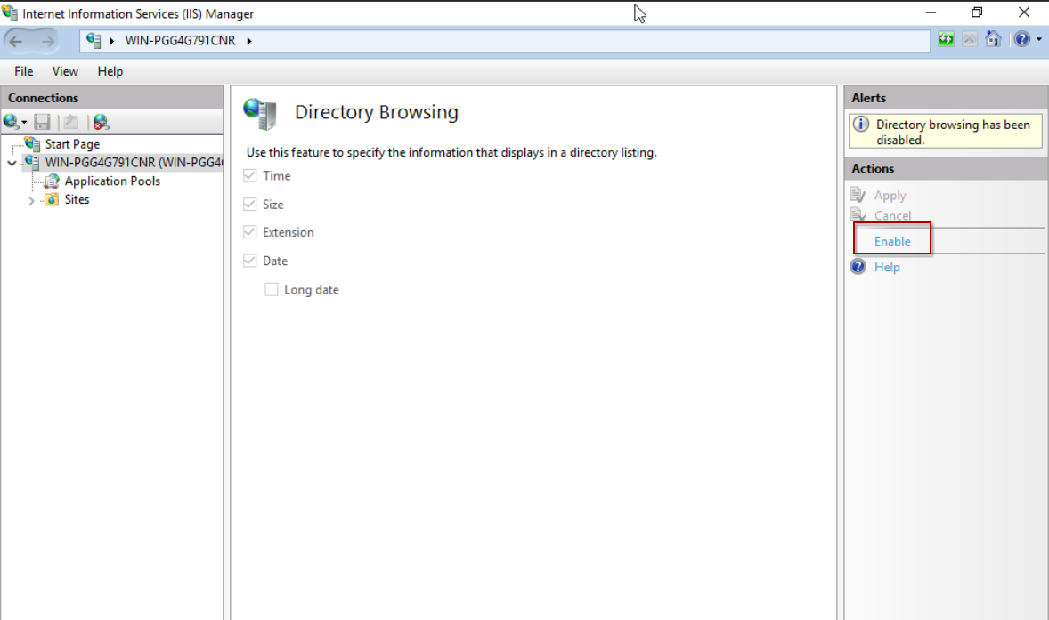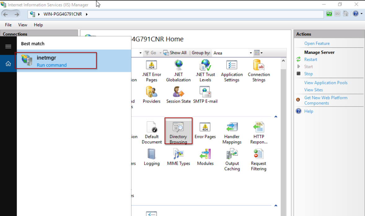 After following these steps, you’ve successfully set up the application to permit file uploads. Windows offers a utility for handling all things web service-related called “inetmgr.” The authorization we bestowed upon the folder could have also been established via “inetmgr.” In either case, this tool will streamline the exploitation process in our lab by enabling the listing of documents in the service. To do this, simply click on “Directory Browsing” and activate it.