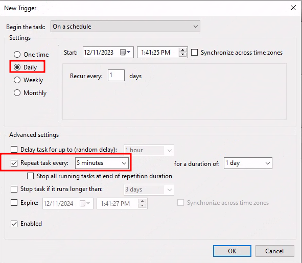 Scheduling the Task: Our task will be set to execute every 5 minutes daily, achieved by adding a new trigger in the scheduler.
