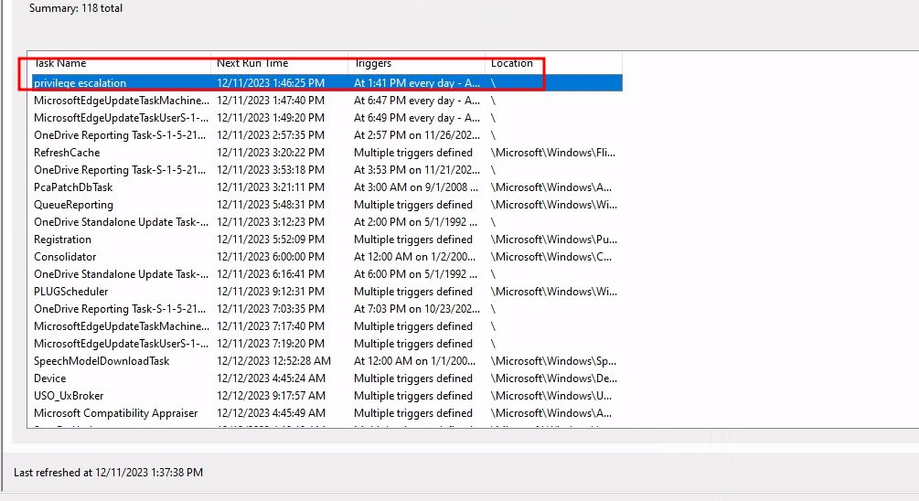 Upon completing these configurations, the newly created task should be visible in the scheduler, marking the successful setup of our lab environment, ready for conducting privilege escalation experiments.