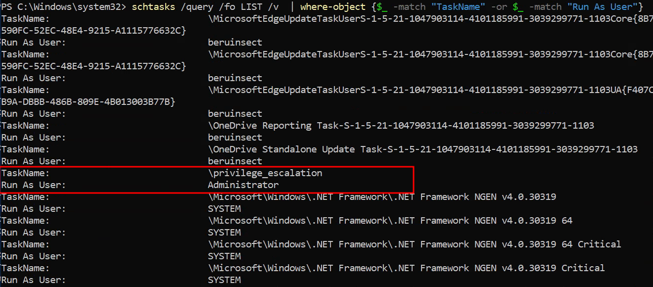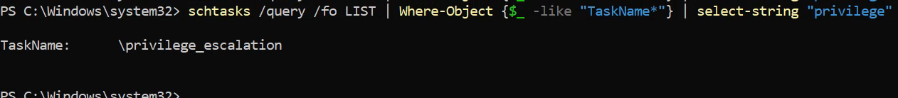 schtasks /query /fo LIST | Where-Object {$_ -like "TaskName*"} | select-string "privilege"