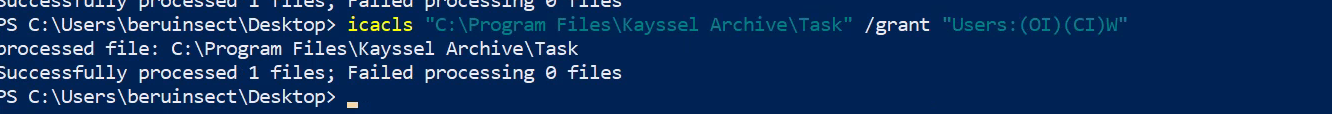 icacls "C:\Program Files\Kayssel Archive\Task" /grant "Users:(OI)(CI)W"