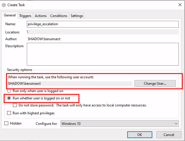 Task Execution Settings: We’ll set the task to start regardless of the user’s login status. This approach is chosen to allow manual execution of the task for our privilege escalation proof of concept (POC), eliminating the need to wait for automatic triggers. Alternatively, you can select “Run only when user is logged on” to mimic a scenario where the task initiates upon an administrator’s login.