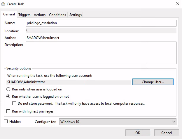 Once the directory and the binary that will execute the task have been created, we are going to configure it. In my case I am going to create the task using the user beruinsect which is a user of the domain. I recommend following the process since I have been trying different ways, and it can give problems later when it comes to be able to detect the vulnerable task with the user that we are going to simulate the intrusion.