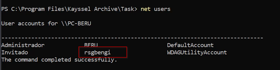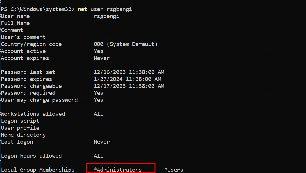 Post-execution, verify the creation of a new user in the administrators’ group, marking the success of the privilege escalation.