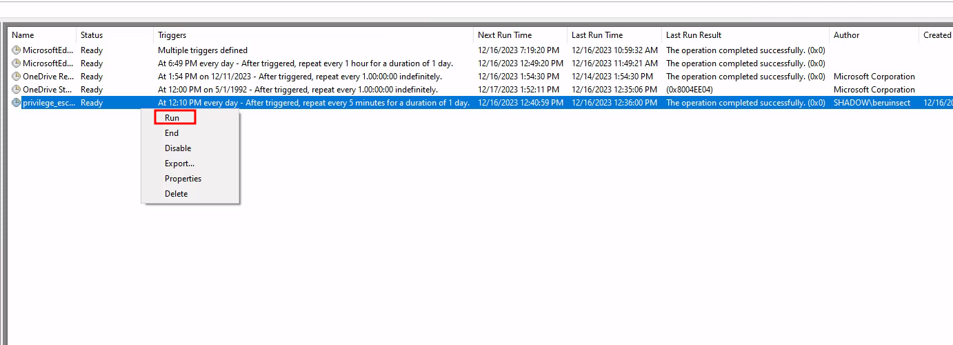 Assigning Execution Privileges: Crucially, we’ll assign task execution rights to an administrator. This step is pivotal for potential privilege escalation.