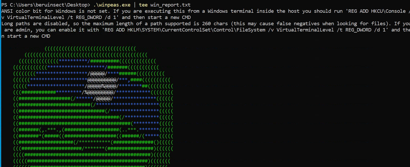 For this attack, I’m using the user “beruinsect”, a standard user not in the administrators’ group. To detect the vulnerability, we can use Winpeas, just as we did with DLL hijacking: