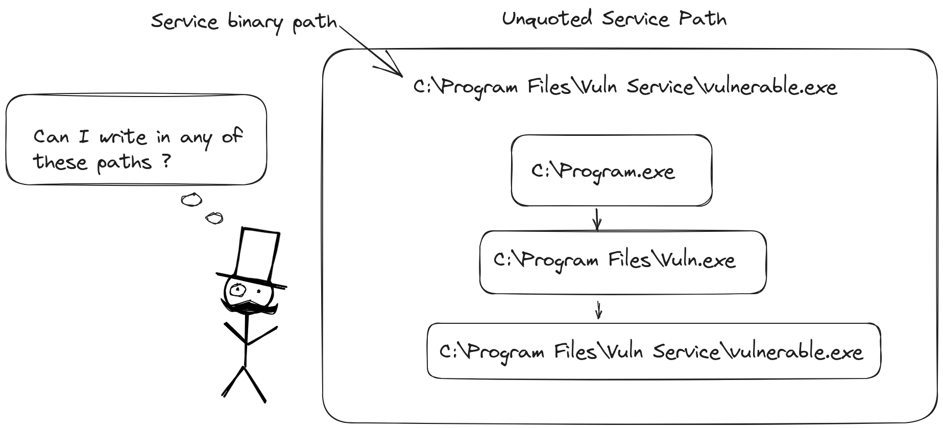 In this diagram, the service binary is “vulnerable.exe”, but due to spaces, Windows perceives multiple paths: