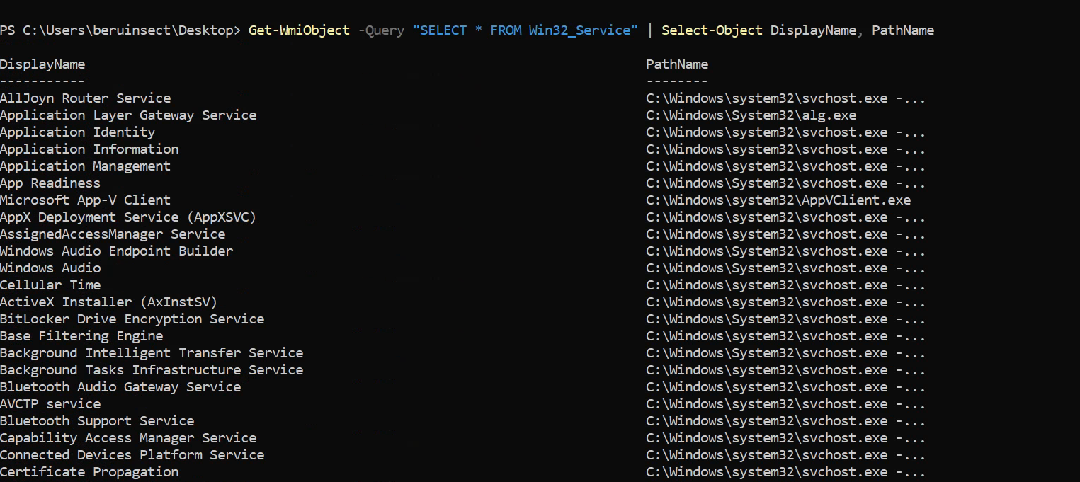 Get-WmiObject -Query "SELECT * FROM Win32_Service" | Select-Object DisplayName, PathName