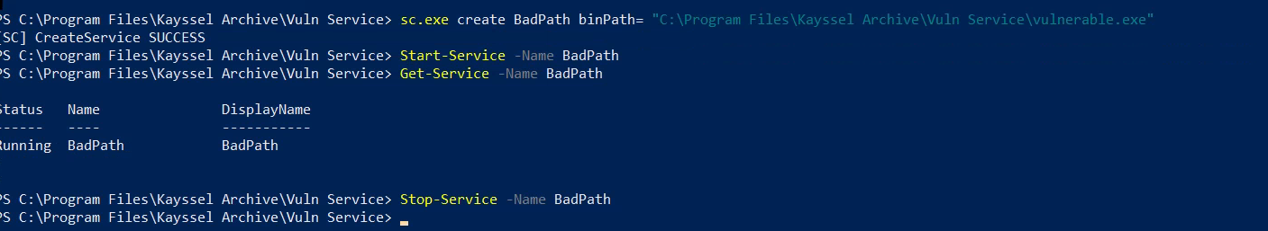 New-Service -Name "BadPath" -BinaryPathName "C:\Program Files\Kayssel Archive\Vuln Service\vulnerable.exe"