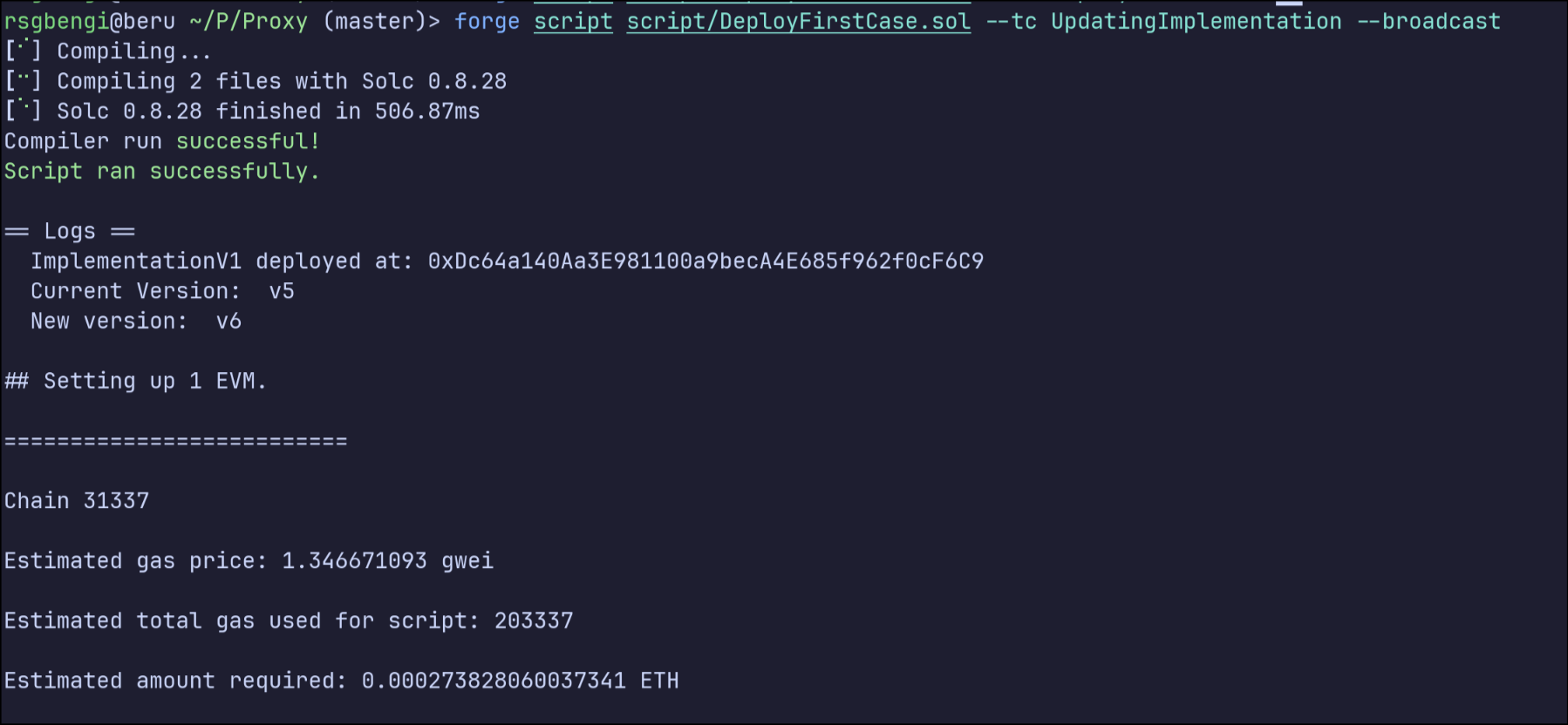 forge script script/DeployFirstCase.sol --tc UpdatingImplementation --broadcast