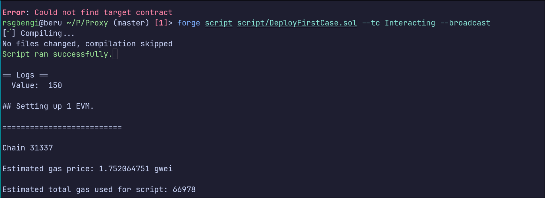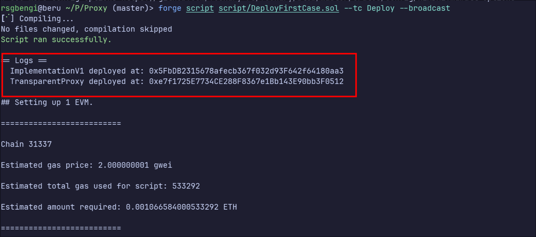 Running this script is simple, and you’ll see the results directly in the console. It’s a straightforward way to test the functionality of the Transparent Proxy and ensure everything is working as intended. You can build on this script to test upgrades or add more complex interactions, but for now, it’s a solid foundation to understand how the proxy operates 😄