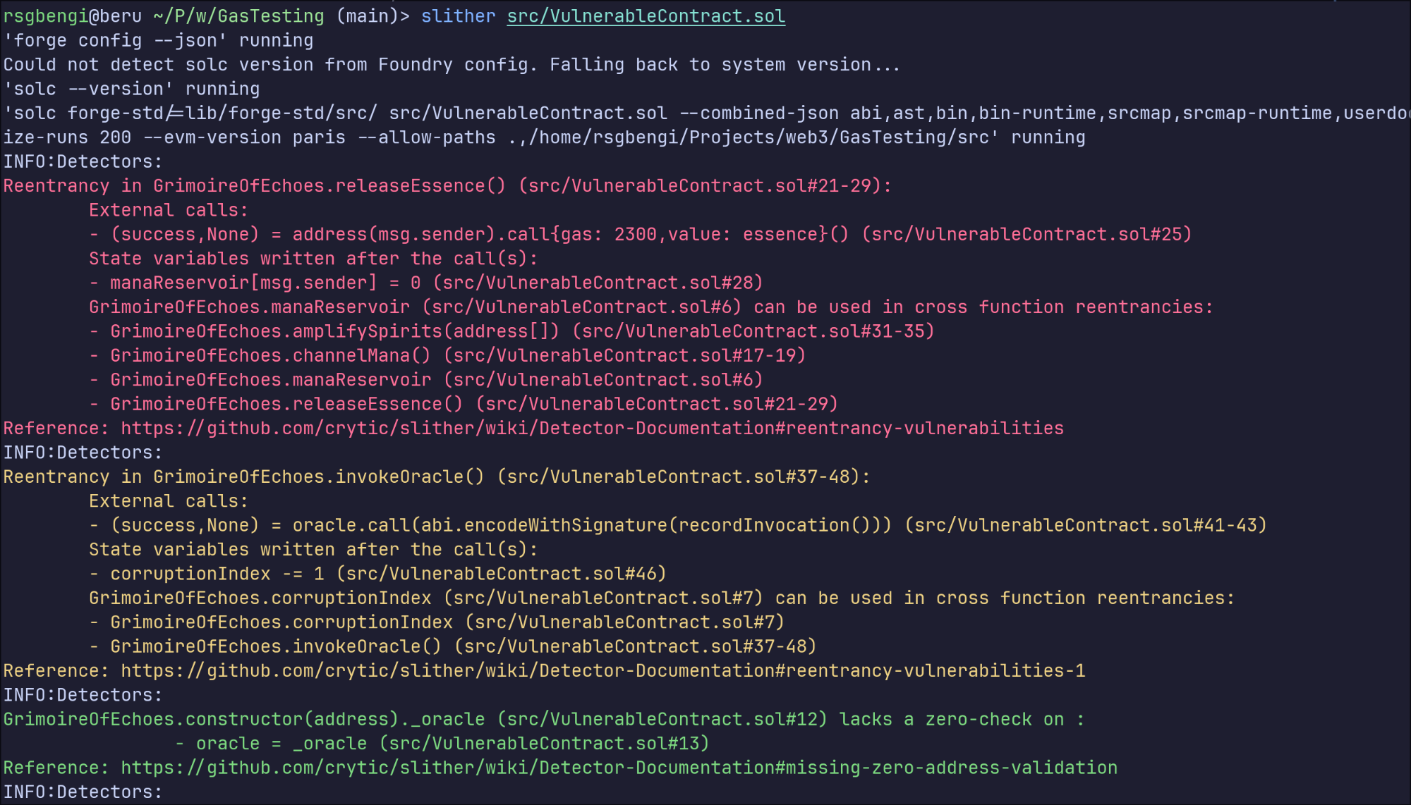 Once executed, Slither will output a detailed report directly in your terminal. For instance, running it on our gas-focused contract reveals potential reentrancy issues and unsafe external calls: