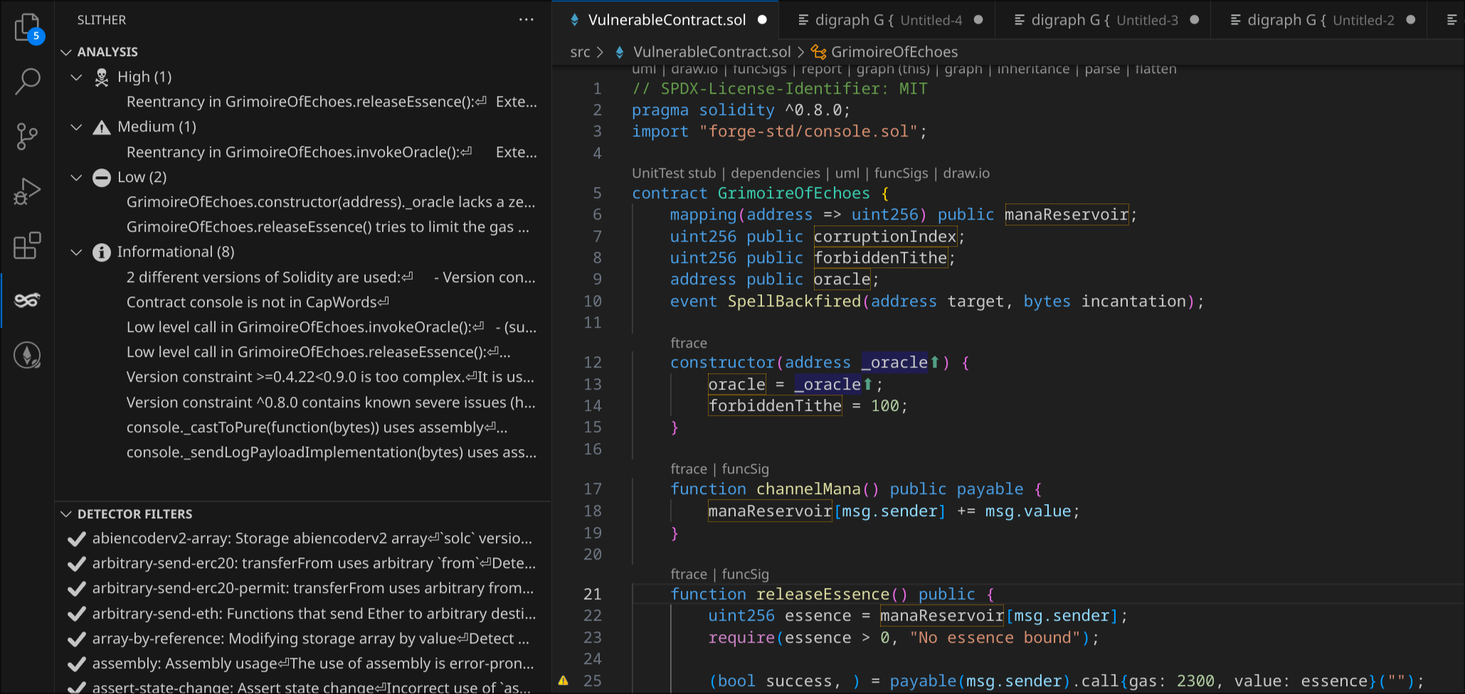 One of my favorite features is the ability to generate interactive graphs that visualize contract structures and relationships. While our example is just a small contract, this becomes invaluable when dealing with complex systems.