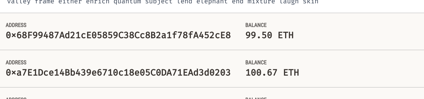 In this simulation, we have three different accounts, each buying a specific item from the shop. Each account is represented by an Ethereum address and a private key. This setup allows us to simulate individual users making purchases, where each user buys an item and becomes its new owner.