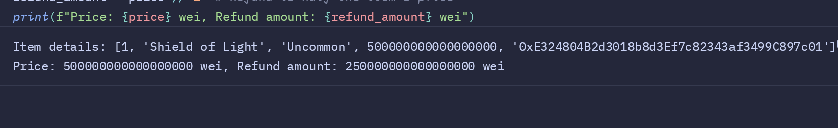 In this part, we choose a high-value item to target for the exploit. We retrieve the item’s details from the contract, including its price, which will allow us to calculate the refund amount. In this case, we’re choosing item_id = 1 for demonstration purposes.