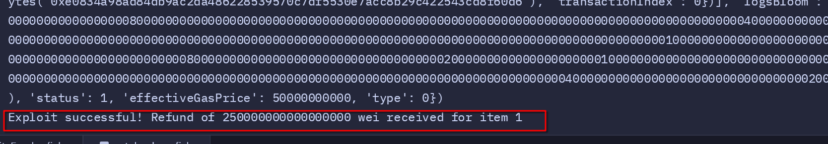 After sending the transaction, we check the transaction receipt to confirm whether the exploit was successful. If the tx_receipt.status is 1, it means the transaction was mined successfully, and the attacker would have received the refund amount. This output confirms whether the exploit has succeeded in triggering the refund for the item.