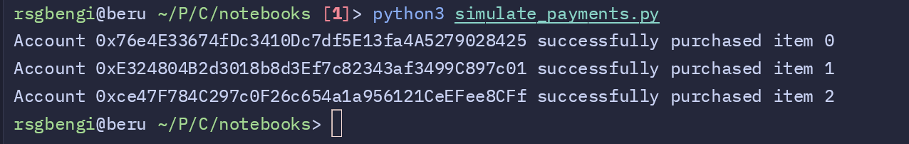 Finally, we call simulate_purchases() to execute the function. Each account will attempt to buy its designated item, and if all goes well, we’ll see a confirmation message for each purchase, confirming that the items have new owners.