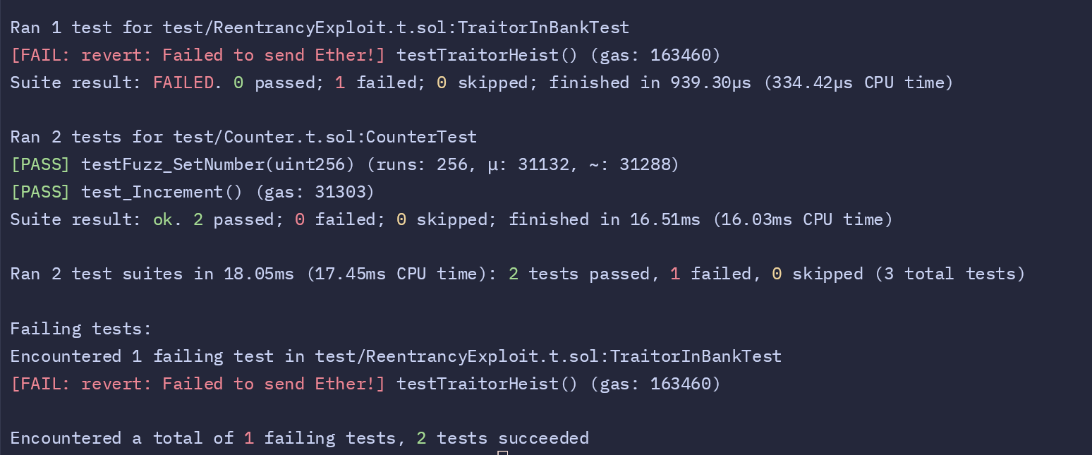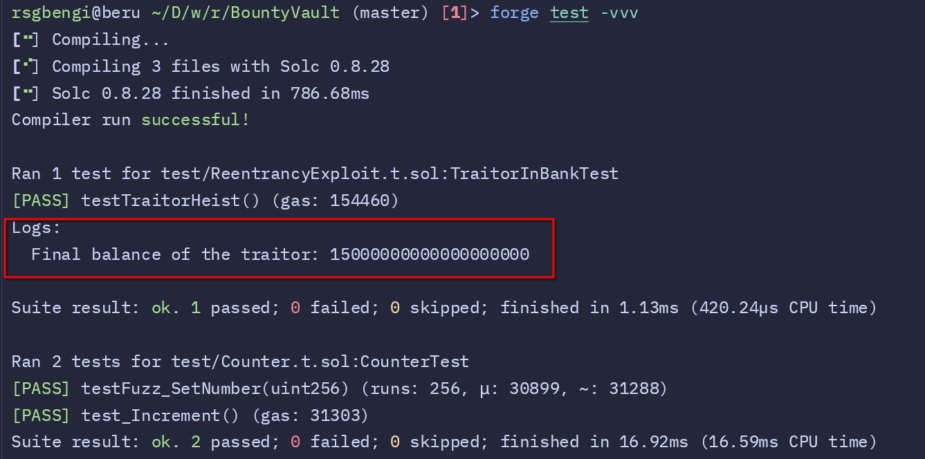 TheTraitorWithin, specifically designed to exploit the vulnerable vault. This contract mimics real-world malicious strategies used in reentrancy attacks. - Automated Testing with Foundry: Testing is the cornerstone of secure smart contract development. In this section, you’ll learn how to simulate a reentrancy attack using Foundry, automate the testing process, and analyze the results.