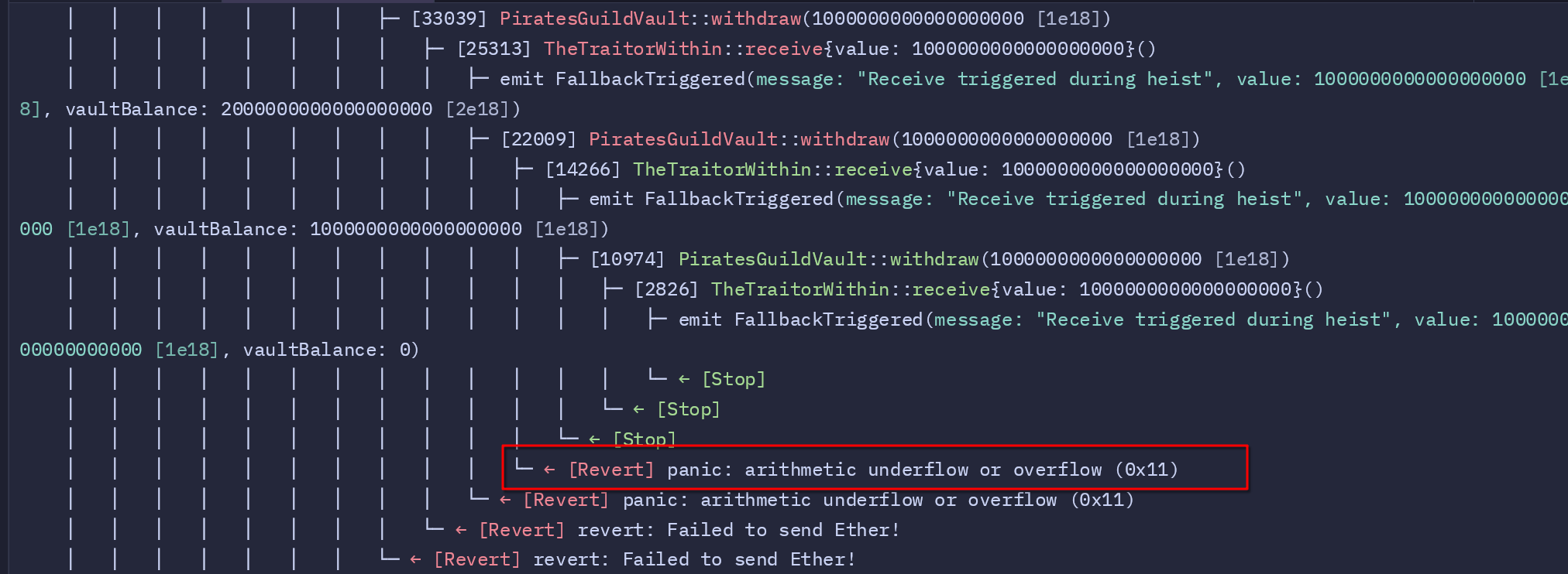 The Forge test output highlights this issue. After draining all the Ether, the recursive attack proceeds, and the vulnerable function fails when it attempts to subtract balances or transfer Ether. This behavior is seen in the trace: