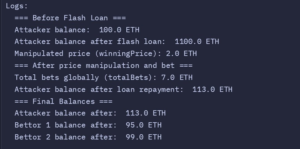 The script checks the final balances to confirm the attacker’s profit and validate the attack’s success.