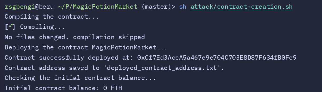 With the network and validator ready, we utilize the deployment script previously discussed to deploy the MagicPotionMarket contract. This script handles everything from compiling the contract to deploying it and saving its address for later use.