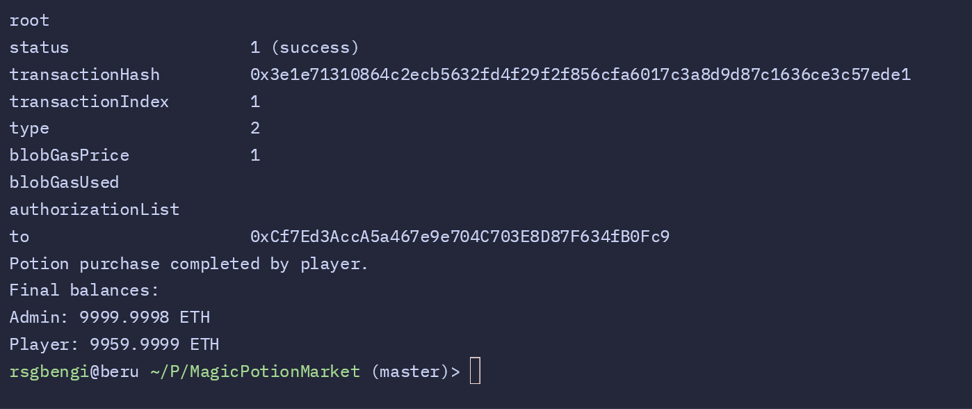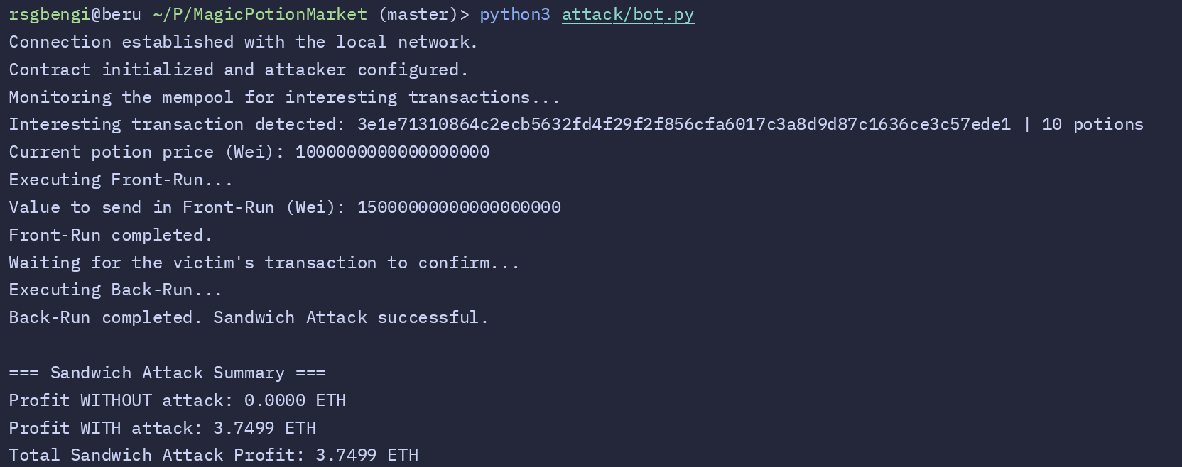 MagicPotionMarketcontract and simulate a transaction from the victim. Its simplicity and efficiency make it perfect for these tasks. - Automating the Sandwich Attack with Python: Finally, we’ll bring everything together with a Python bot. This script will monitor the network, execute the front-running and back-running transactions, and calculate the attack’s profitability. Python’s flexibility allows us to automate the entire process, simulating how an attacker would operate in a real-world scenario.