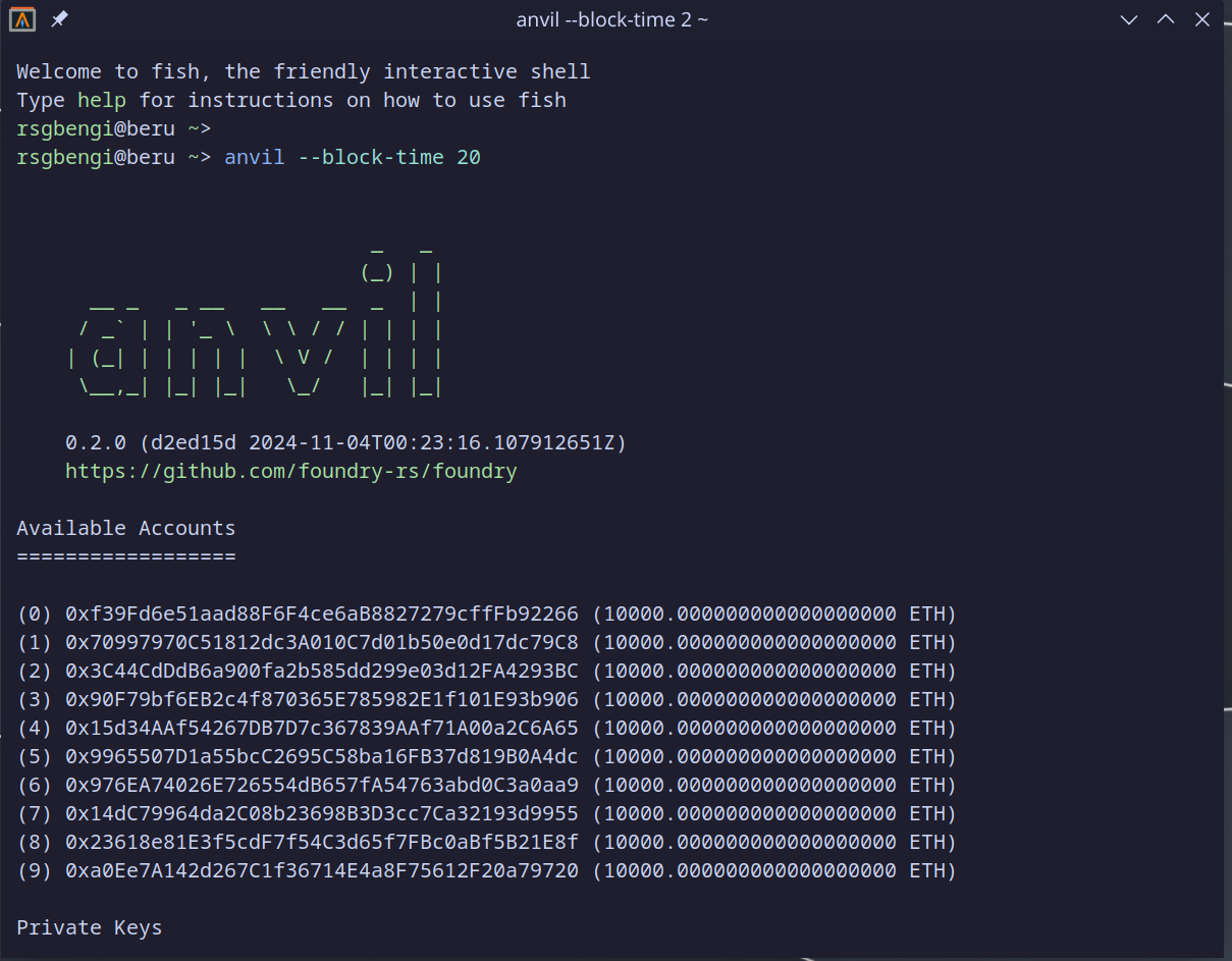 We start by initializing Anvil, Foundry’s blockchain simulation tool, configured with a custom block time of 20 seconds. This delay between blocks gives our validator enough time to monitor transactions in the mempool and execute the necessary front-running and back-running operations.