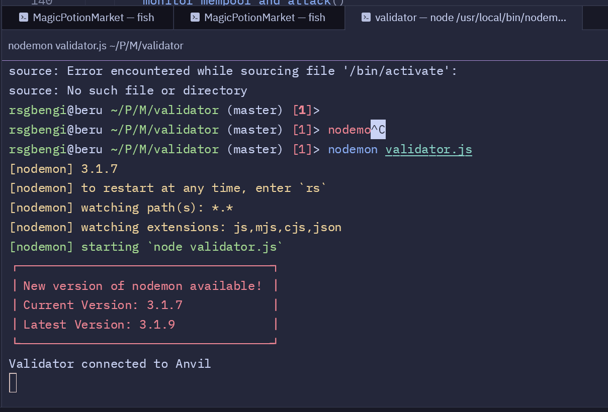 Next, we execute the validator using nodemon, which continuously runs our script and restarts it automatically when changes are detected. This setup ensures a seamless monitoring experience, allowing the validator to stay active and responsive to pending transactions in the mempool.